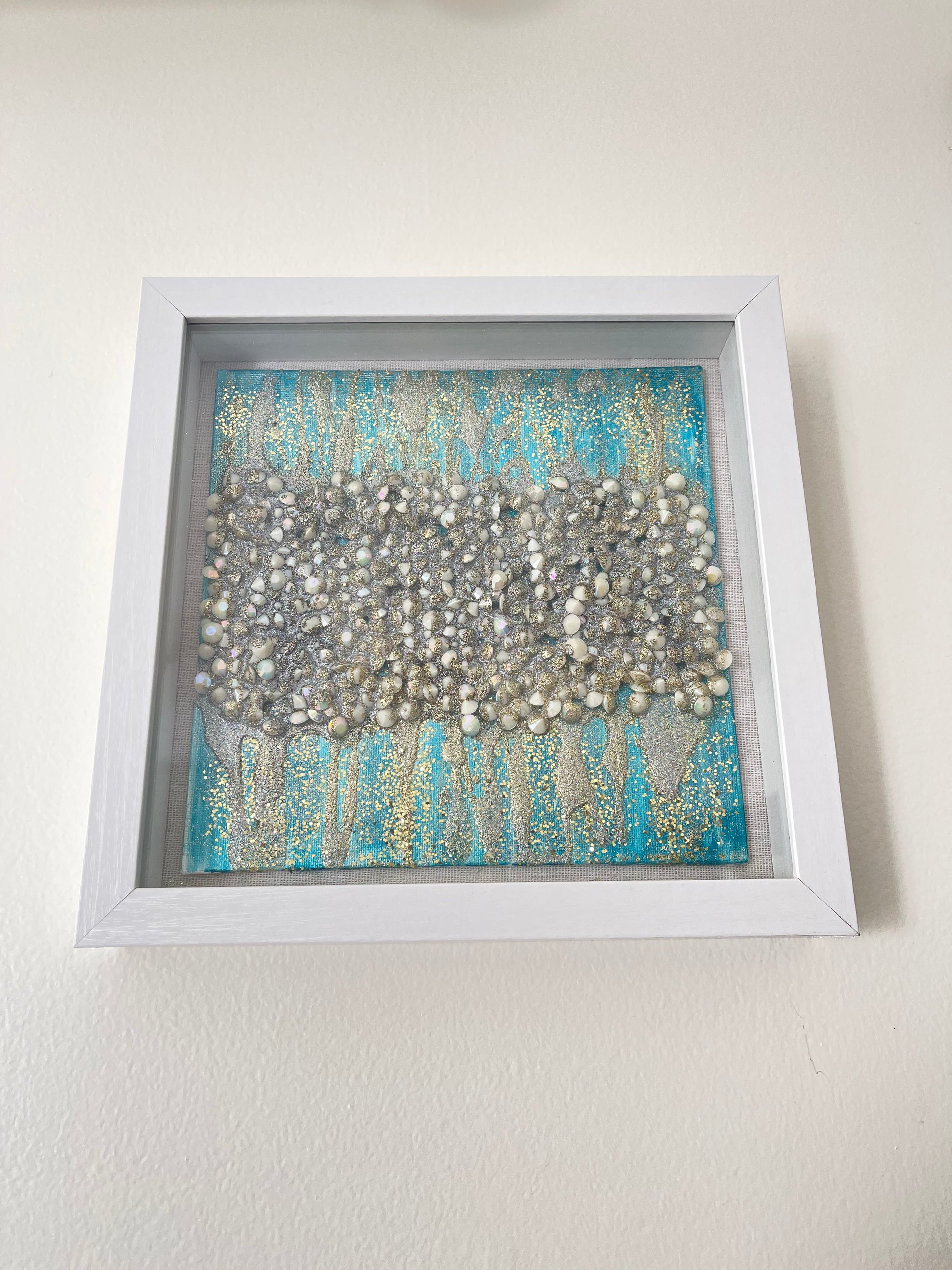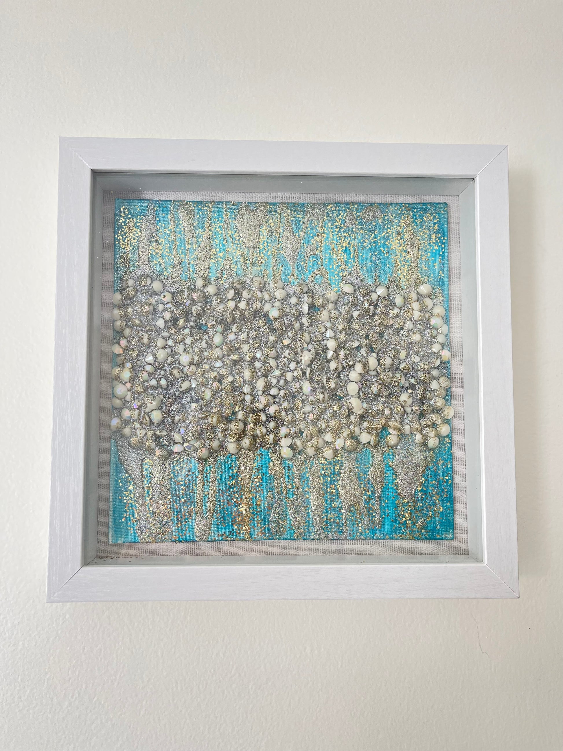 This stunning piece of abstract glitter art will bring a dynamic blend of elegance and texture to any space. Set against a rich turquoise blue background, the artwork features a shimmering fusion of gold and silver glitter that creates a captivating visual experience. The interplay of metallic tones adds depth and movement, while the unique textured elements bring an additional layer of intrigue. Encased in a sleek white 9x9 shadow box frame, this piece is ready to be displayed, adding a touch of modern sophistication and artistry to your home or office. Perfect for those, who appreciate the beauty of abstract design with a sparkling twist.