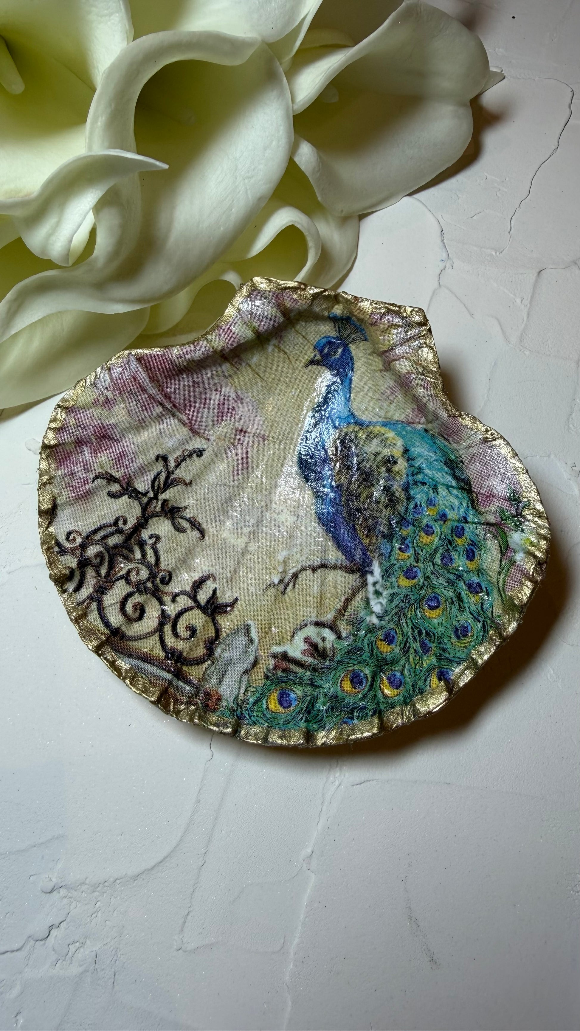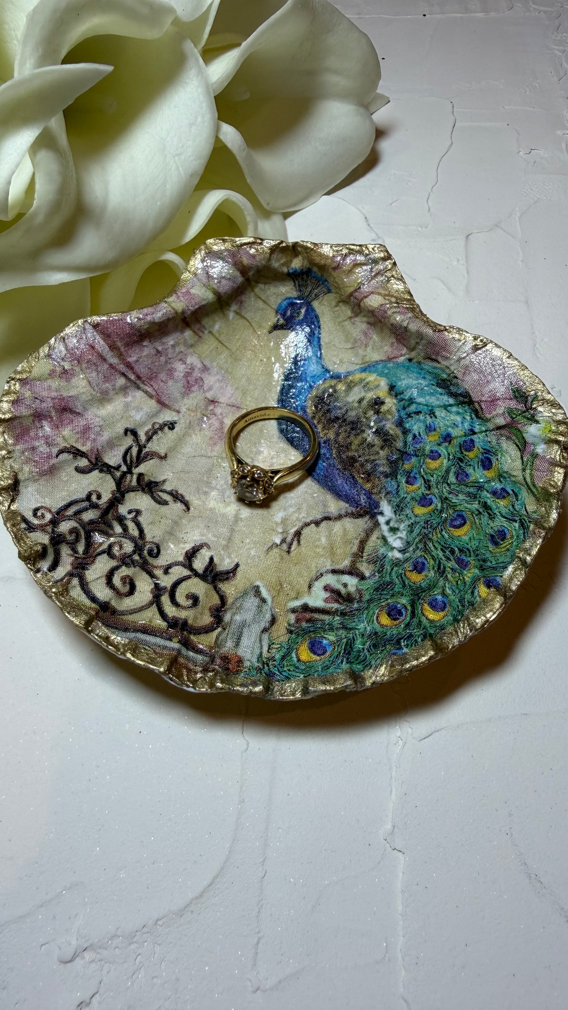 This beautiful and elegant scallop shell ring dish features an exotic peacock design. It is decoupaged with decorative paper on the inside. The edges and the back of the shell are hand-painted with liquid gold leaf. Glossy varnish is added at the end to seal and provide a protective coating on the inside. Please be advised that the shells are not waterproof.